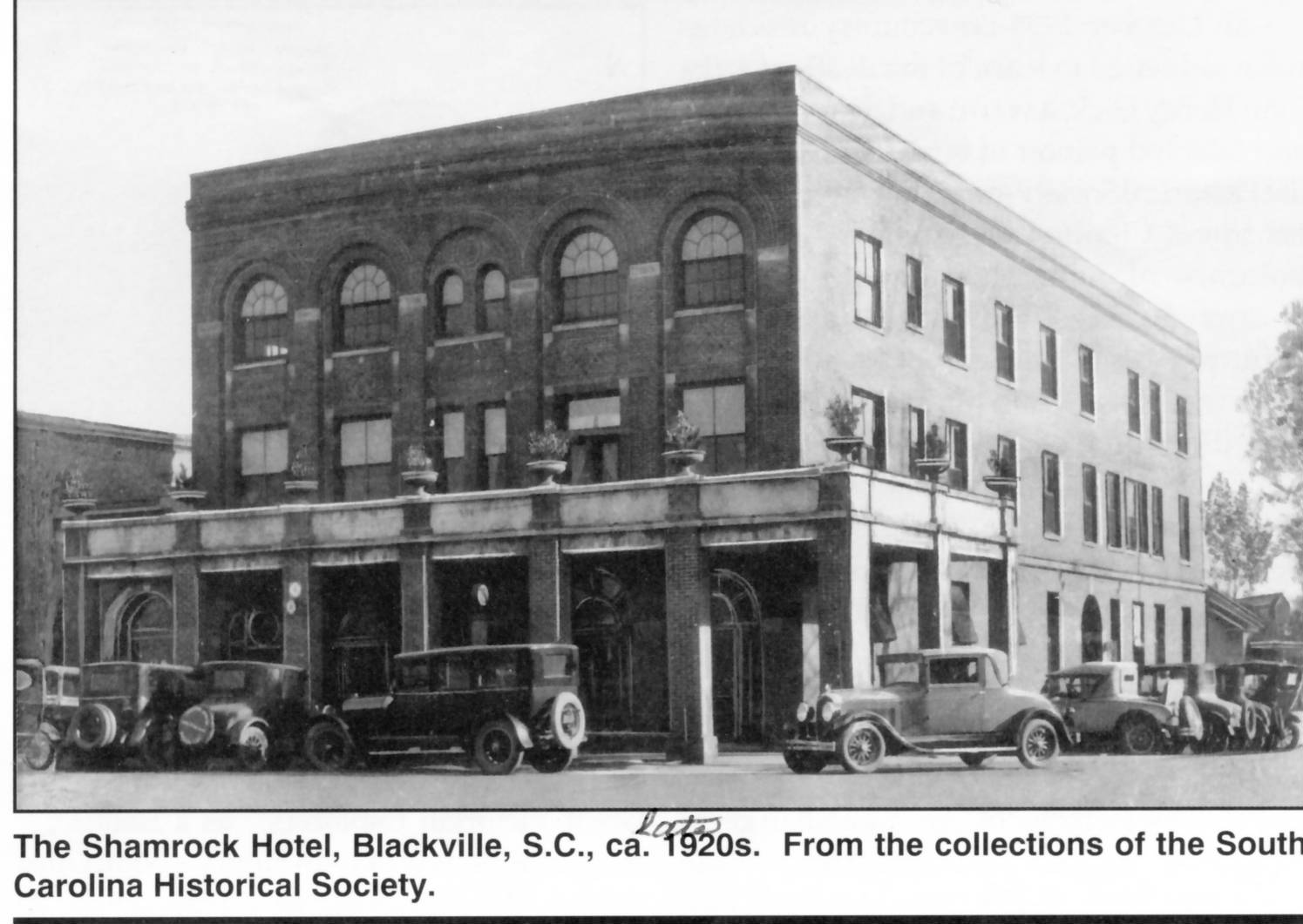 Mr. Marion Paulling operated “The Shamrock, Blackville’s handsome new hotel” according to an article in The Barnwell People in January, 1913. An article in the same newspaper in January, 1914, gives a report on the conditions in Blackville and mentions new buildings: “Among the buildings is the Shamrock Hotel, at a cost of over $20,000, having thirty rooms besides several stores and offices, all equipped with latest furnishings.” It is not known how long Mr. Paulling operated the hotel. Sometime prior to 1920 the Groves family assumed management of the hotel. A member of the Groves family purchased the hotel in 1932 and continued managing it until the last person to operate the hotel purchased it in 1958. Due to lack of business during the winter months, the hotel was operated on a part-time basis from 1960 through 1968 when it was closed for the last time. Several businesses continued to operate on the ground level until 1982. A pharmacy was located on the ground level of the Shamrock at the corner of Main and Walker Streets. Epps’ Pharmacy contained a marble soda fountain, and for many years a rack of comic books, making it a favorite hang-out for the town’s young folk. During it’s heyday, the lobby of the Shamrock was a gathering place for some of the locals as well as guests of the hotel. There were several tables for writing or playing games, and a pool table in the back of the lobby. A lively game of poker was often enjoyed after dinner in the convivial atmosphere. The built-in registration desk was near the front. The floor was of white ceramic tile with “The Shamrock” spelled out in green tiles near the lobby entrance, and the ceiling was of white embossed metal. The front portion of the ground level contained two offices, the hotel main entrance, and a pharmacy on Main Street. There was an office on the Walker Street side which was occupied several times by beauty salons and finally an electronics shop. There was also a Walker Street entrance to the hotel. The dining room occupied about a third of the second floor, with the kitchen and a screened porch at the rear. Deliveries were made by the outside stairs to the kitchen area. The ceiling of the dining room was of embossed metal similar to the lobby. Four large wooden columns rose from the lobby through the second floor dining room supporting the third floor. The gleaming four-light chandeliers featured clear ribbed glass shades. Dining room furniture included a large buffet, china cabinet, serving table, dining table, (which could easily seat ten) and chairs made of walnut in the William and Mary style. There were also four square oak tables which could seat four and two larger oblong oak tables for seating of six or eight. Accessories included white dinnerware imprinted with the green shamrock set on sparkling white damask tablecloths. An eight-day Regulator clock hanging on the wall ticked the hours away. The Shamrock employed excellent cooks and the ladies of the Groves family were noted for their special “Shamrock Dressing” recipe for tossed salad. The interior walls of the building were tongue and groove wainscot from the baseboards up about three feet and the rest of the walls were plaster painted in pastel colors. Light green with white trim was predominant in the lobby, dining room and halls. Floors on the second and third stories were of hardwood, some covered with rugs, except the bathrooms which had white ceramic tile floors. Each guest room had a lavatory. Two rooms had private baths and eight rooms had semi-private baths, while the other rooms offered a central bathroom for ladies on the second floor, and one for the men on the third floor. Each room was originally furnished with an oak dresser and writing desk and chair and one or more iron beds. Some of the iron beds were exchanged for more modern wooden beds with inner spring mattresses during the later years. There was a large cedar-lined storage closet for linens on the second and third floors. The hotel manager lived in an apartment of three rooms and bath on the northeast corner of the second floor. During the sixties and seventies, there was a small sitting area on the second floor where guests could watch television or read. The balcony was an inviting spot for relaxing in the evening breeze during the hot summer months. The hotel was often filled to capacity during the late spring and summer. The rooms were occupied by vacationers, salesmen, buyers, and truck drivers from all over the United States. Fall and winter months were not as busy, but brought enough repeat guests to keep the hotel marginally profitable until the later years. Salesmen traveled mostly by train until the early 1940's, and many of those passing through the area regularly stayed overnight at the Shamrock. Some continued this routine even after cars became more accessible and larger towns within easy driving distance. As use of the train declined, so did business for the Shamrock. The Shamrock, once a stately edifice, slowly crumbled due to time and neglect. Though Blackville Business Ventures hopes to restore new life to the remains, in 2009 only a portion of the red brick walls and the facade of gracefully arched windows remains.